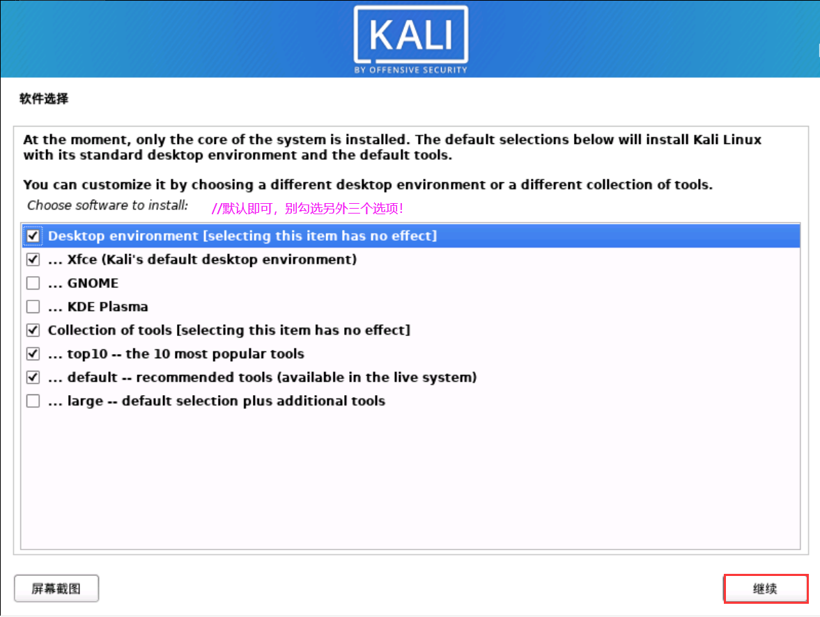 注:默认即可点击继续,别勾选 GNOME 和 KDE,可能导致开机卡死!