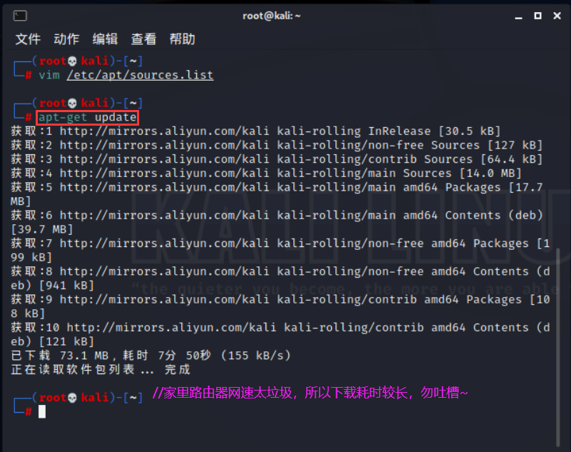1.vim /etc/apt/sources.list2.'//是包管理工具 apt 所用的记录软件包仓库位置的配置文件'3.'//更换Kali的更新源,下载的话从国外下载很慢,这里我们选择替换为阿里云的'4.5.deb http://mirrors.aliyun.com/kali kali-rolling main non-free contrib6.7.deb-src http://mirrors.aliyun.com/kali kali-rolling main non-free contrib1.apt-get update2.3.'//访问源列表里的每个网址,并读取软件列表,然后保存在本地电脑'4.'//我们在软件包管理器里看到的软件列表,都是通过update命令更新的'建议到了这步可以快照保存一波,之后小伙伴们自行折腾~