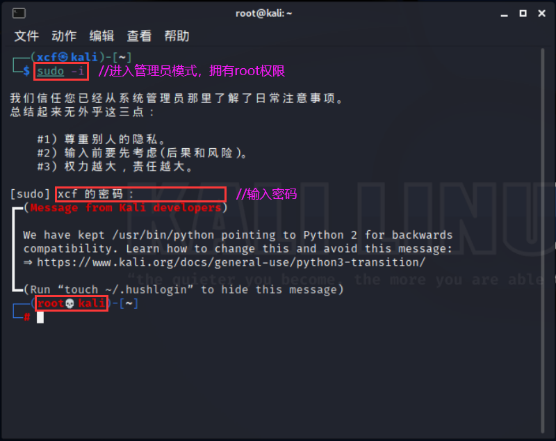 ④登录 Kali 并更新软件包