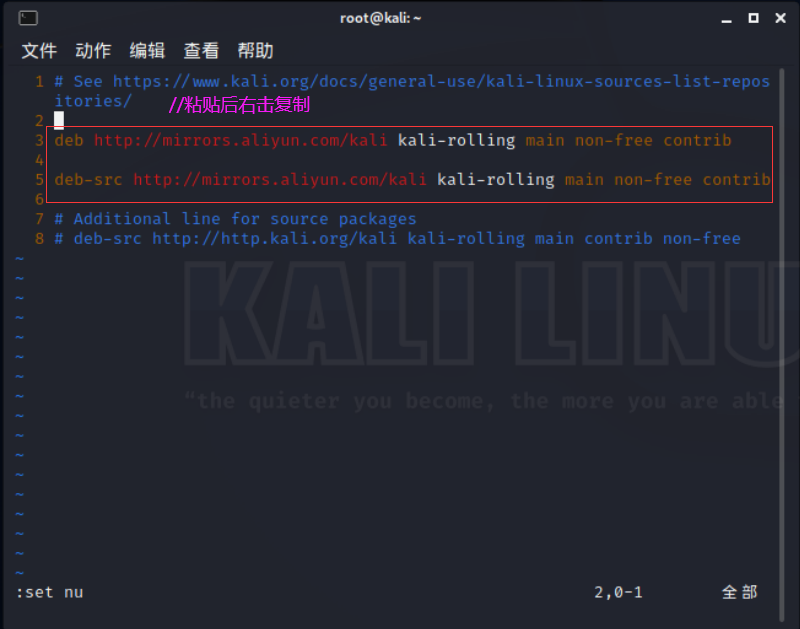 1.vim /etc/apt/sources.list2.'//是包管理工具 apt 所用的记录软件包仓库位置的配置文件'3.'//更换Kali的更新源,下载的话从国外下载很慢,这里我们选择替换为阿里云的'4.5.deb http://mirrors.aliyun.com/kali kali-rolling main non-free contrib6.7.deb-src http://mirrors.aliyun.com/kali kali-rolling main non-free contrib1.apt-get update2.3.'//访问源列表里的每个网址,并读取软件列表,然后保存在本地电脑'4.'//我们在软件包管理器里看到的软件列表,都是通过update命令更新的'建议到了这步可以快照保存一波,之后小伙伴们自行折腾~