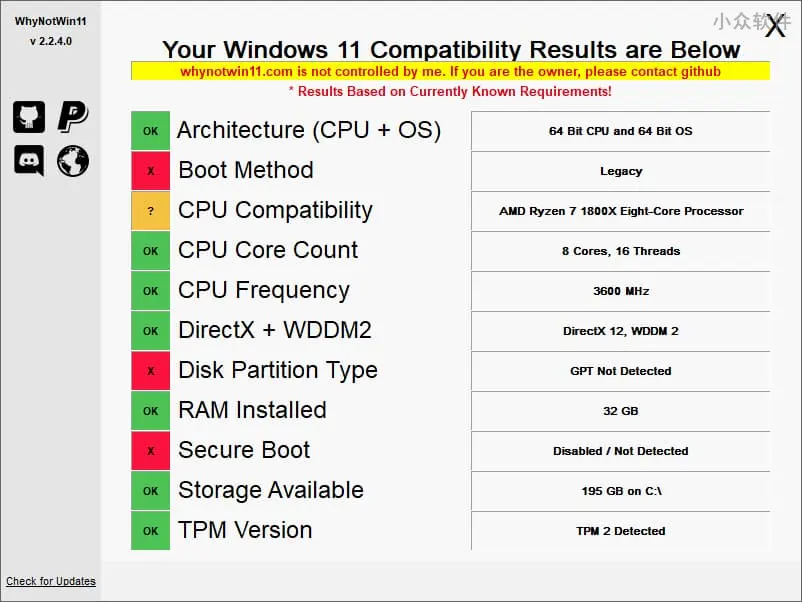 WhyNotWin11 是一款开源的,用来检查电脑是否符合微软提供的Windows 11 最低配置要求的工具。