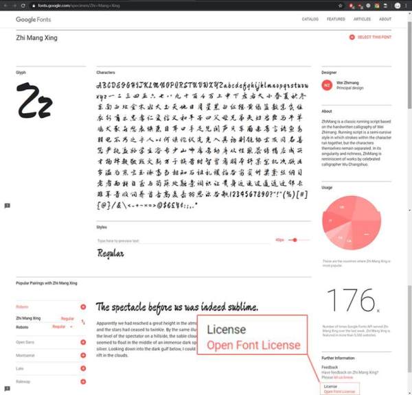 以下是Google Fonts页面上的截图,感谢本站网友“夜煞之乐”提供截图及字体文件。