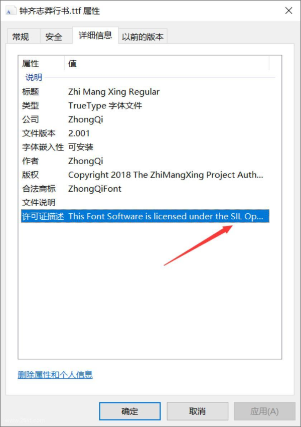 查看字体的文件属性也可以看到,此款字体是SIL Open Font License 1.1授权的。