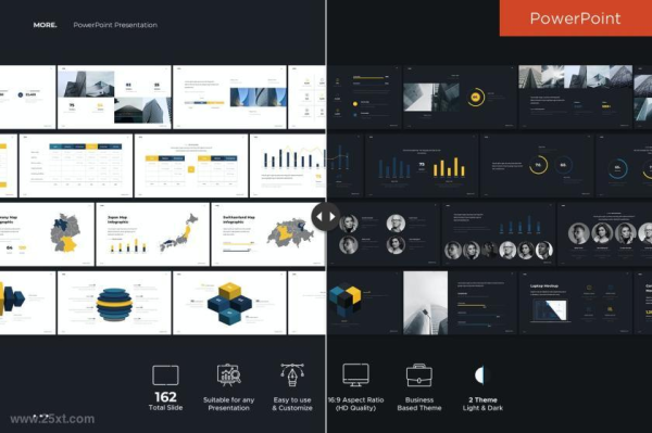 这是一套双色多图表多用途商务PowerPoint模板,总共包含了162张独特设计的幻灯片,尺寸为16:9,有81张深色主题和81张浅色主题的幻灯片,整体风格简洁端庄,商务风十足。模板全部使用免费网络字体,内含超多精心设计的信息图表,和可以图标,可以根据需要自由编辑修改模板所有元素,非常适合用作品牌分析、商业计划书、工作汇报、项目总结等商务主题的展示。