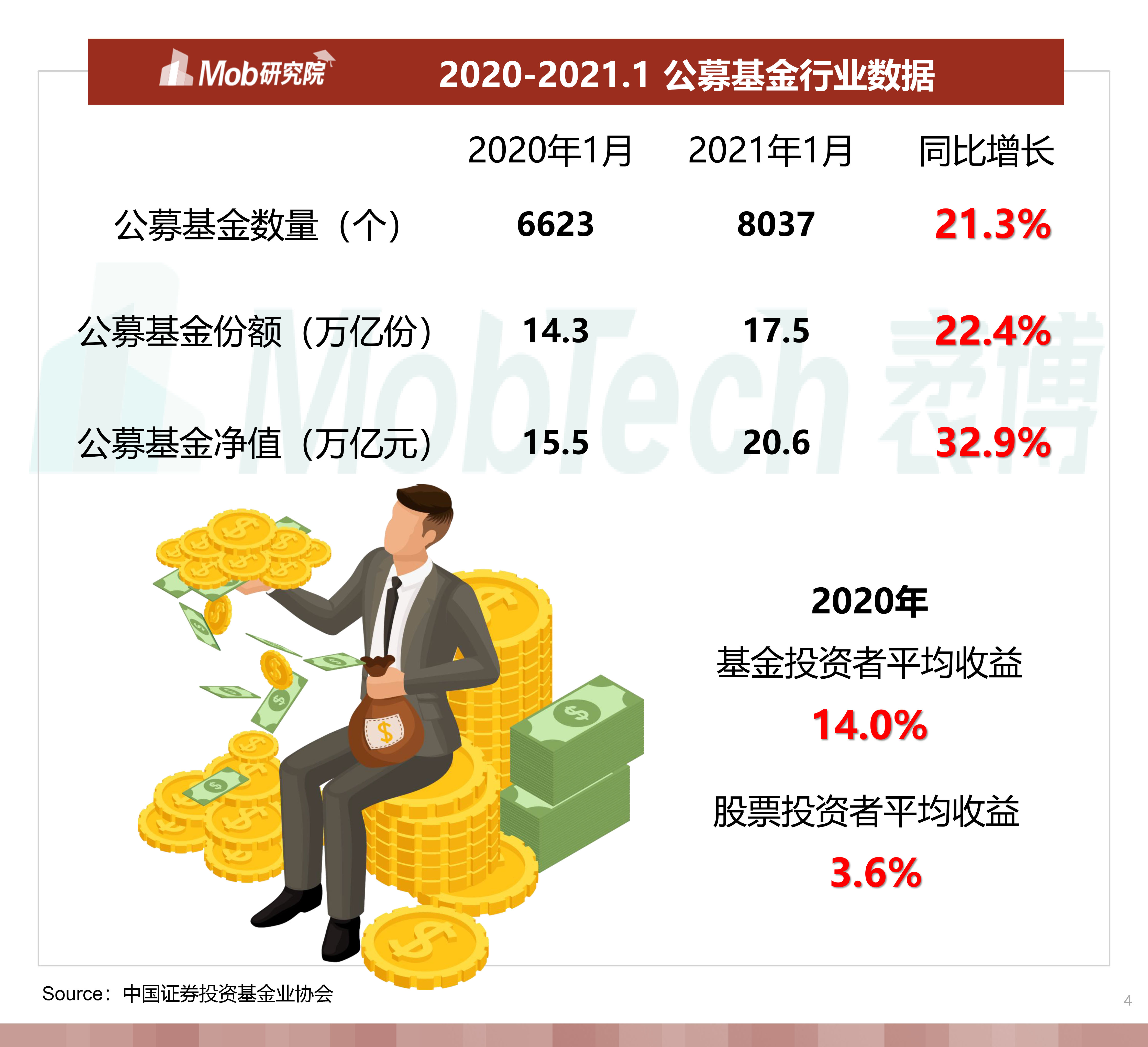 2020年公募基金行业各数据上升迅猛,同比增长均超20%,基民收益率“跑赢”股民,基金行业迎来“高光时刻”