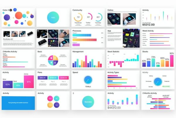 这是一套彩色的数据统计和信息图表设计keynote模板,简洁清晰的图表模板,文件内包含了100页的数据统计页面和信息图表元素。可以用在财务汇报、后台管理页面设计、ppt演示文稿、或者app的统计数据等设计中。所有形状、文本和图表均可通过Keynote编辑。