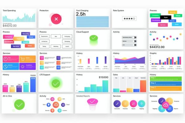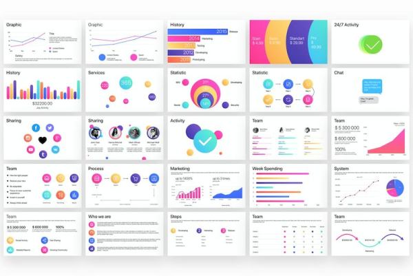 可以用在财务汇报、后台管理页面设计、ppt演示文稿、或者app的统计数据等设计中。所有形状、文本和图表均可通过Keynote编辑。