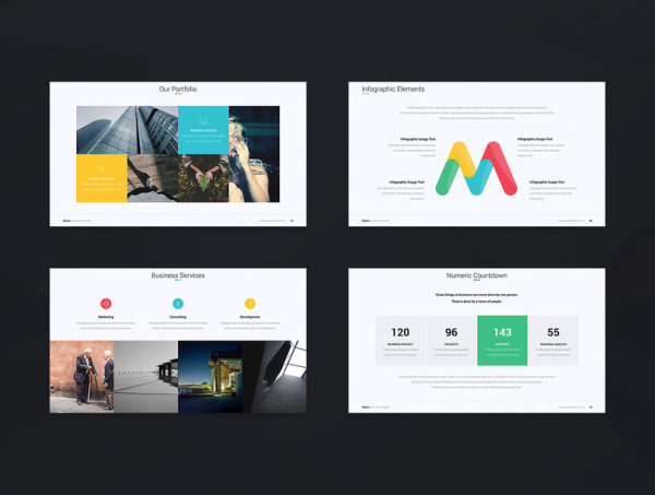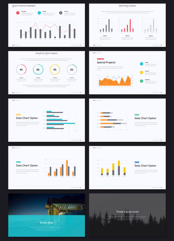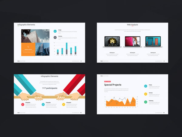 本套商务ppt模板设计现代,动画切换效果精彩,能帮助您设计出独特有趣的ppt。本套模板包含了120个页面,提供了4中色彩方案。模板可以任意编辑。另外赠送了可直接使用的上百个图标。