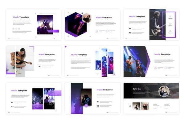 一组特别的音乐节PPT模板,适用于音乐节提词等。它采用紫色系的设计,给人一种酷炫的感觉。共有50+特色页面,包含了媒体播放、样机、图表等,并且所有页面都包含了过渡效果。(注:不包含图片)