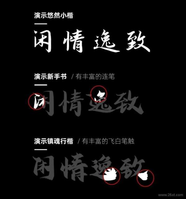 《辞海》有语:形体方正,笔画平直,可作楷模。说的,便是楷书 楷体中以小楷清秀流丽、润泽含蓄,可填补系列字的中庸之位,于是便有了这款演示悠然小楷