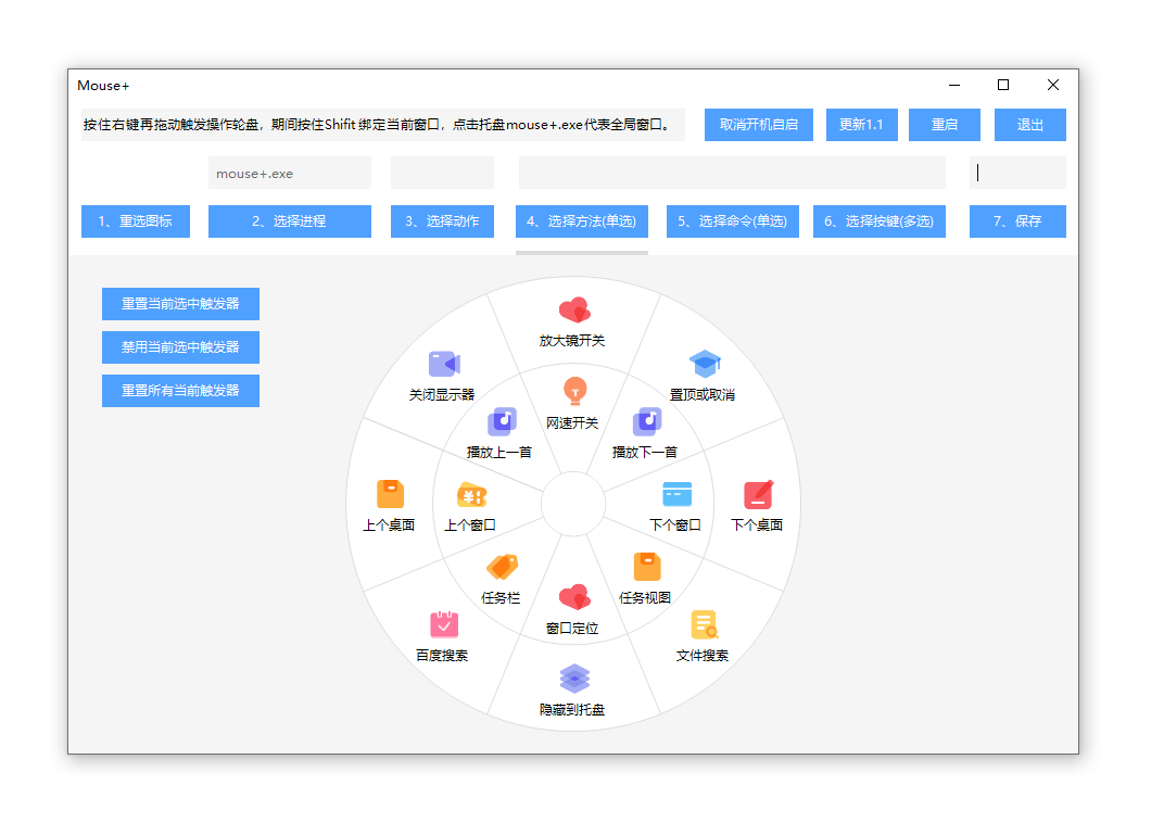 MousePlus中文免费版是一款轻便小巧的鼠标右键增强工具,使用鼠标右键拖动即可唤醒鼠标轮盘,实现相关的功能,这个功能界面和quicker的轮盘软件界面一样,操作逻辑也一致,MousePlus 目前也比较的轻便,没有多少不必要的功能,小巧轻便,主要 MousePlus 这个软件还是免费啊。MousePlus官方版是一款专门为电脑鼠标提供的右键增强工具,我们可以通过这款软件来为电脑鼠标的右键添加很多的全新功能!