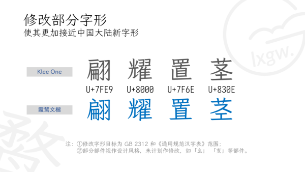 第一,原有字体和后补字体之间有着一定的差异,致使一些不同的文字(如 Klee 原有汉字与后补简体字)混排之后会有违和感。