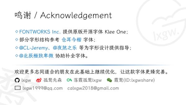 字体授权:霞鹜文楷基于Fontworks开发并发布的Klee开源项目。Klee是Fontworks的商标。霞鹜文楷采用SIL Open Font License 1.1授权发表。在猫啃网下载的字体包中已经附带SIL Open Font License 1.1授权文件,如甲方或公司需要出示授权文件,直接使用此文件即可。