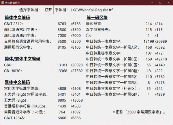 下面这个图统计了这款字体里面包含多少个简体字数和繁体字数等信息,方便大家直观地了解这款字体的简繁字体数量。中国大陆的小伙伴只需特别关注GB2312和3500字常用汉字表的数量就可以了。这个统计软件是来自马来西亚的网友“夜煞之乐”编写提供给猫啃网使用,十分感谢他的分享!如果您想下载这款字体统计软件,可以在GitHub或者码云进入该软件的开源项目进行下载。