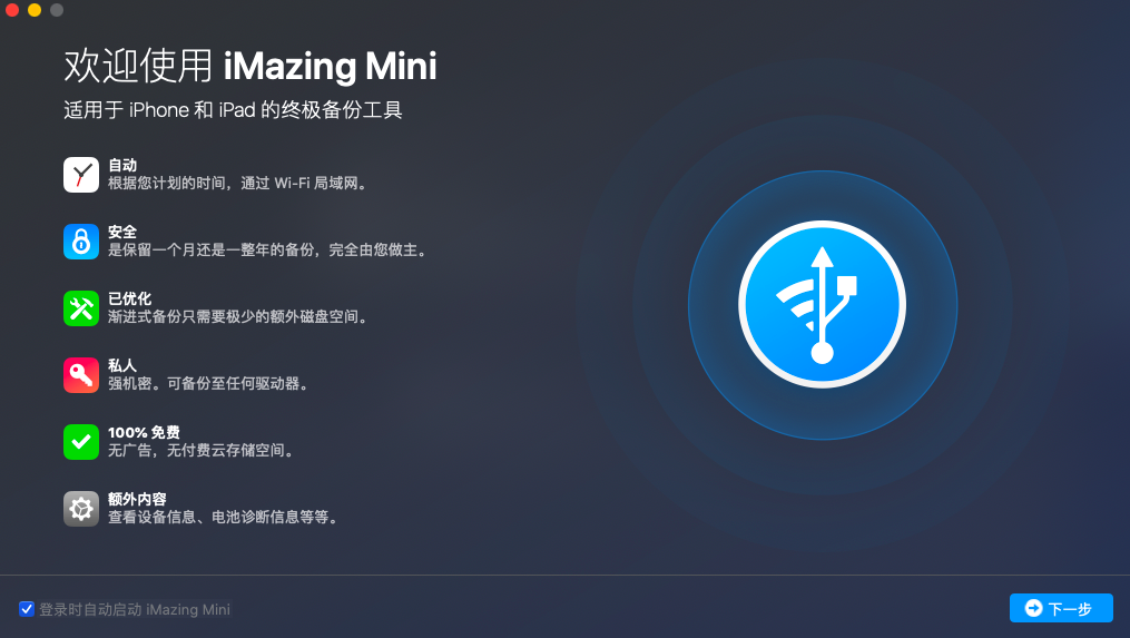 iMazing现在与iMazing Mini打包在一起,iMazing Mini是一个免费的菜单栏应用程序,可自动和无线地备份您的iOS设备!从iMazing 2.3开始,iMazing Mini包含在iMazing中。