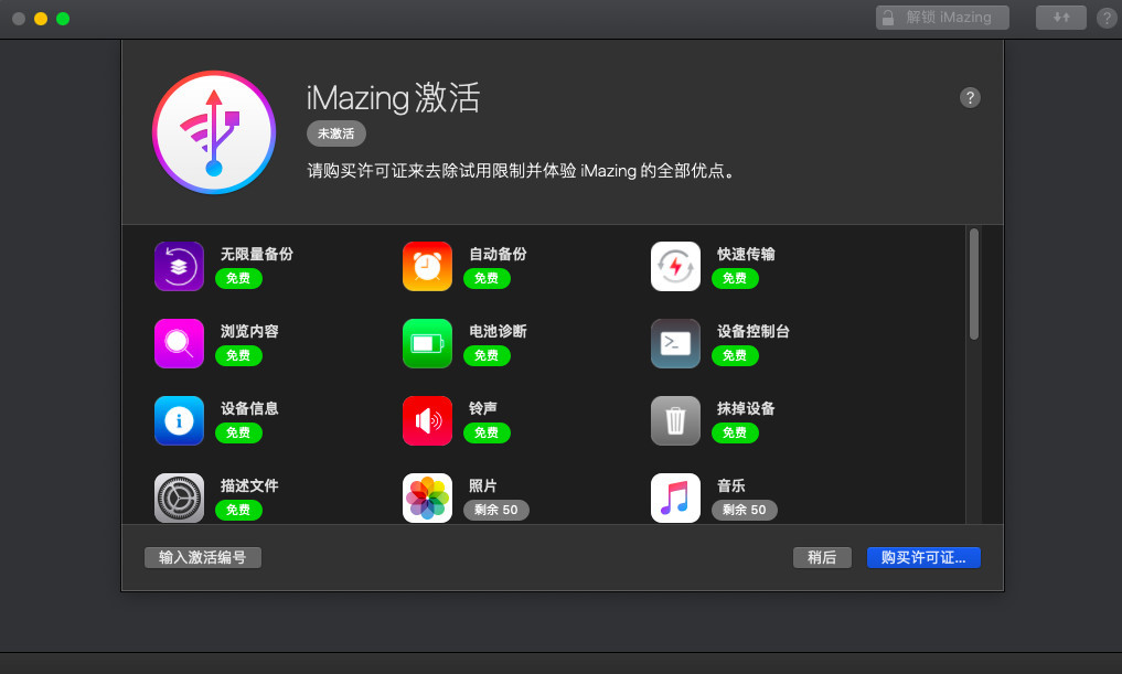 iMazing的许多功能是免费提供的,但是如果需要解锁无限量的数据导出,恢复备份以及更新或重新安装iOS的能力是需要使用许可证来解锁的。