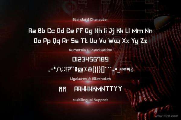 Maztech是一款创意的科技风机械拼接效果的无衬线英文字体,字体包含了大写英文字母、小写英文字母、0-9十个数字、标点符号和备用字形。字体为机械拼接样式,设计独具创意,科技感十足,包含了OTF、TTF、WOFF和WOFF 2 格式文件,非常适合用于科幻、军事和运动等主题海报、广告、小说封面、邀请函、服装、网站banner、包装等的设计。