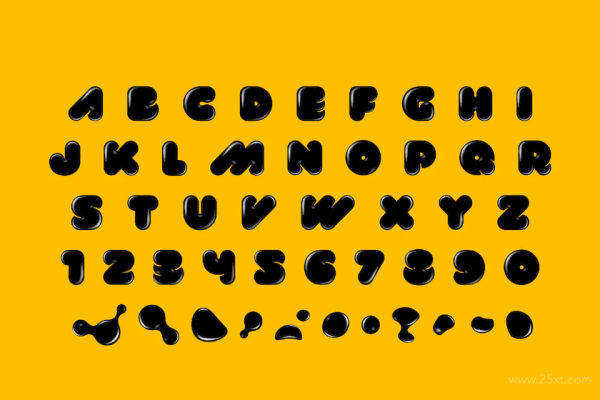 一款黑油漆效果的矢量英文字体,看起来非常友好且具有娱乐性,可用作标题,logo,字母组合等。字体除了26个英文字母外,还有点缀的一滴滴油漆效果。字体格式为ai和png。