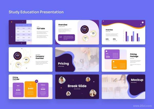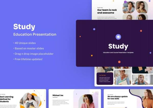 Study是一套教育研究主题的PowerPoint演示模板,尺寸为16:9的宽屏比例,总共有40张设计精美、排版专业的高品质模板。尺寸为1920(宽)×1080(高)px,模板使用免费字体,包含众多图表,直观漂亮。其中图像素材易于编辑,您可以任意编辑大小,根据设计需求自由调整、随意更改编辑模板内的文字、图标、背景和图片。非常适用于创意代理和教育推广。