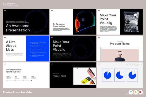 一套现代简洁的商务PPT&Keynote演示模板,总共有4种不同的风格,拥有1920x1080像素的高分辨率,尺寸为16:9的宽屏比例,内含50多张设计精美、排版专业的高品质模板,同时包括具有时尚感的插图和信息图表。模板中的背景时尚简洁,所有图形都可以随意调整颜色、大小,您可以根据设计需要自由编辑素材,非常适合业务宣传、营销策略方案、公司报告、公司简介、项目介绍、也可用于个人作品集。