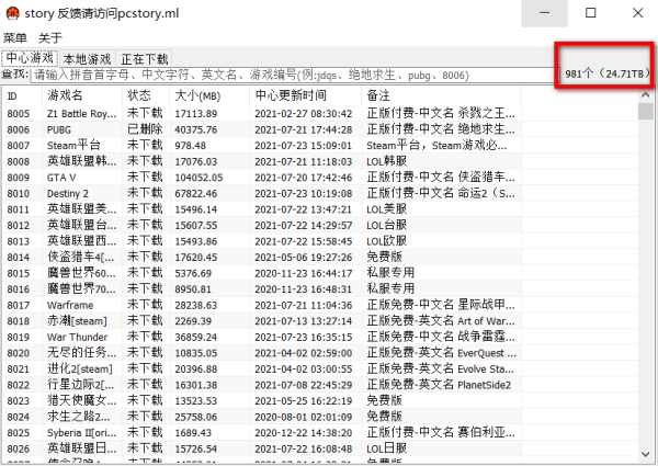 下载器中一共有981个游戏,24TB,比如LOL美服,LOL欧服,LOL台服之列的主流游戏都是有的,当然,一些非主流的游戏也有很多,快来下载体验吧