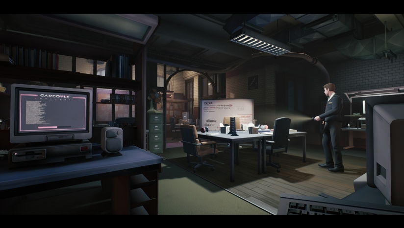 游戏中的谜题和故事都是非线性的,每个区域中都会有许多可以互动的地方。我们可以偷偷潜入藏有机密文件的办公室,从中盗取或者销毁有用信息;还可以打开冷气或者暖气,这时你会看到其中的NPC在行为或者话语上因为环境的改变而有了新的动作或新的讨论话题。