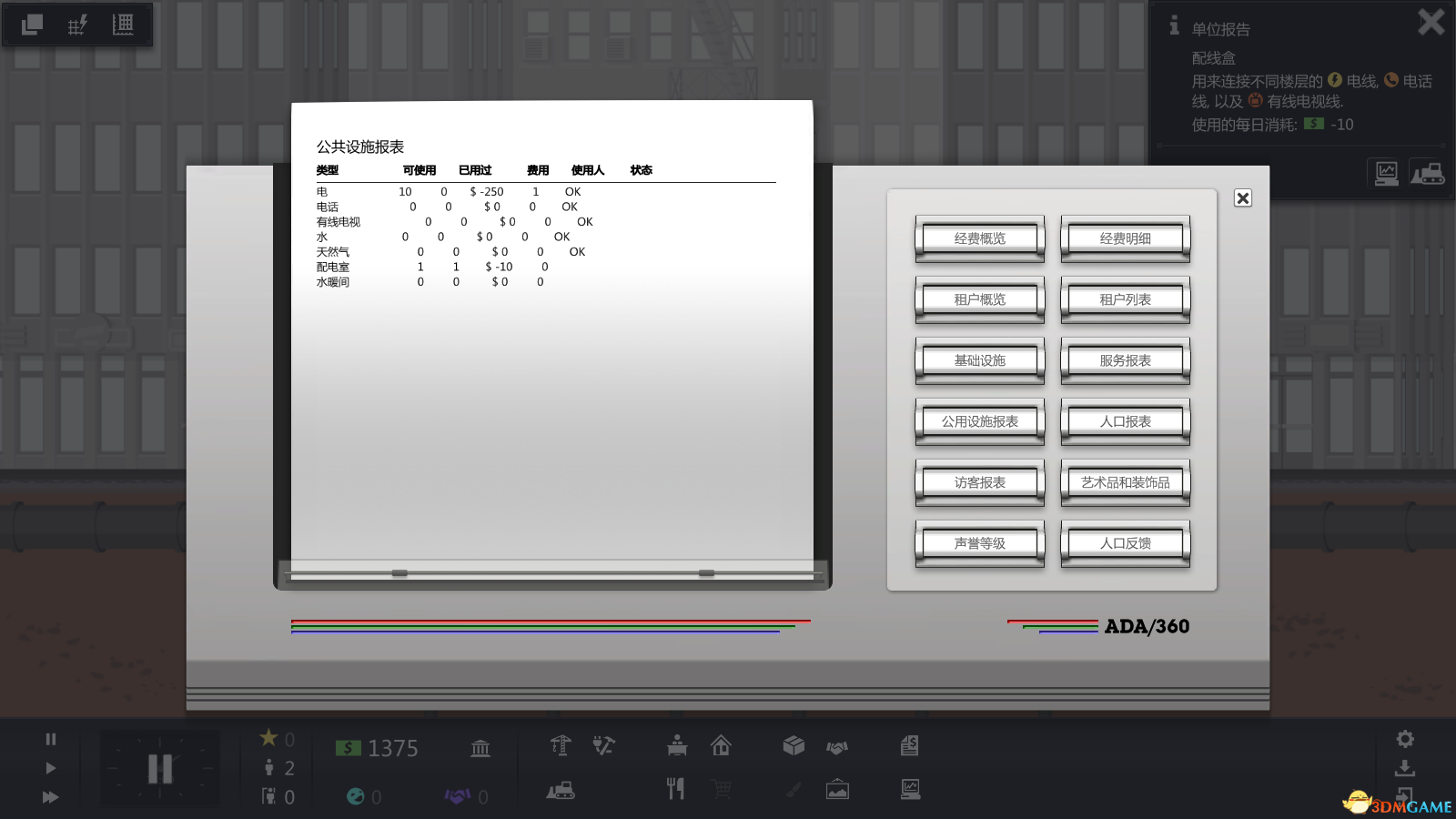 比方说,在房客搬进来之前,玩家需要先安排好一间新房屋,还要布好水电,还得连好电话线、电线和天然气管道。有时候玩家还得去地下增设配电箱、变压器、收发器、水表和天然气支管来增加可供给的住户数量,而且大厦每一层还需要建造新的设备间。技术上讲,这不费什么工夫:简单点一下打开设备图层,然后拖拽几下鼠标在房间周围布好不同颜色的管道和电线就可以了。