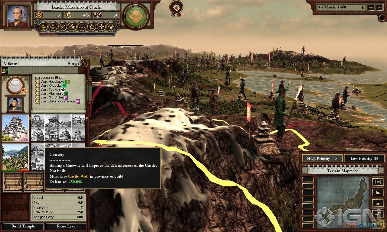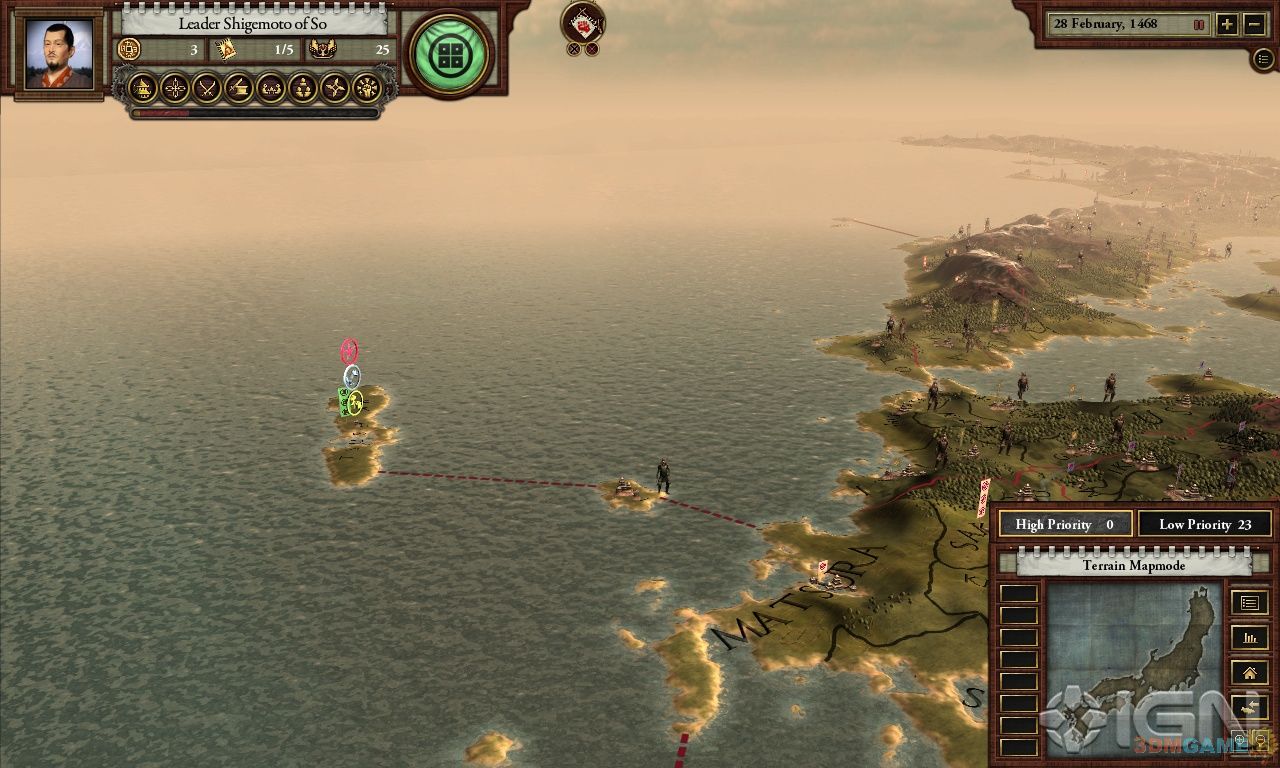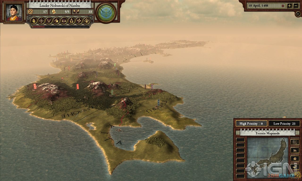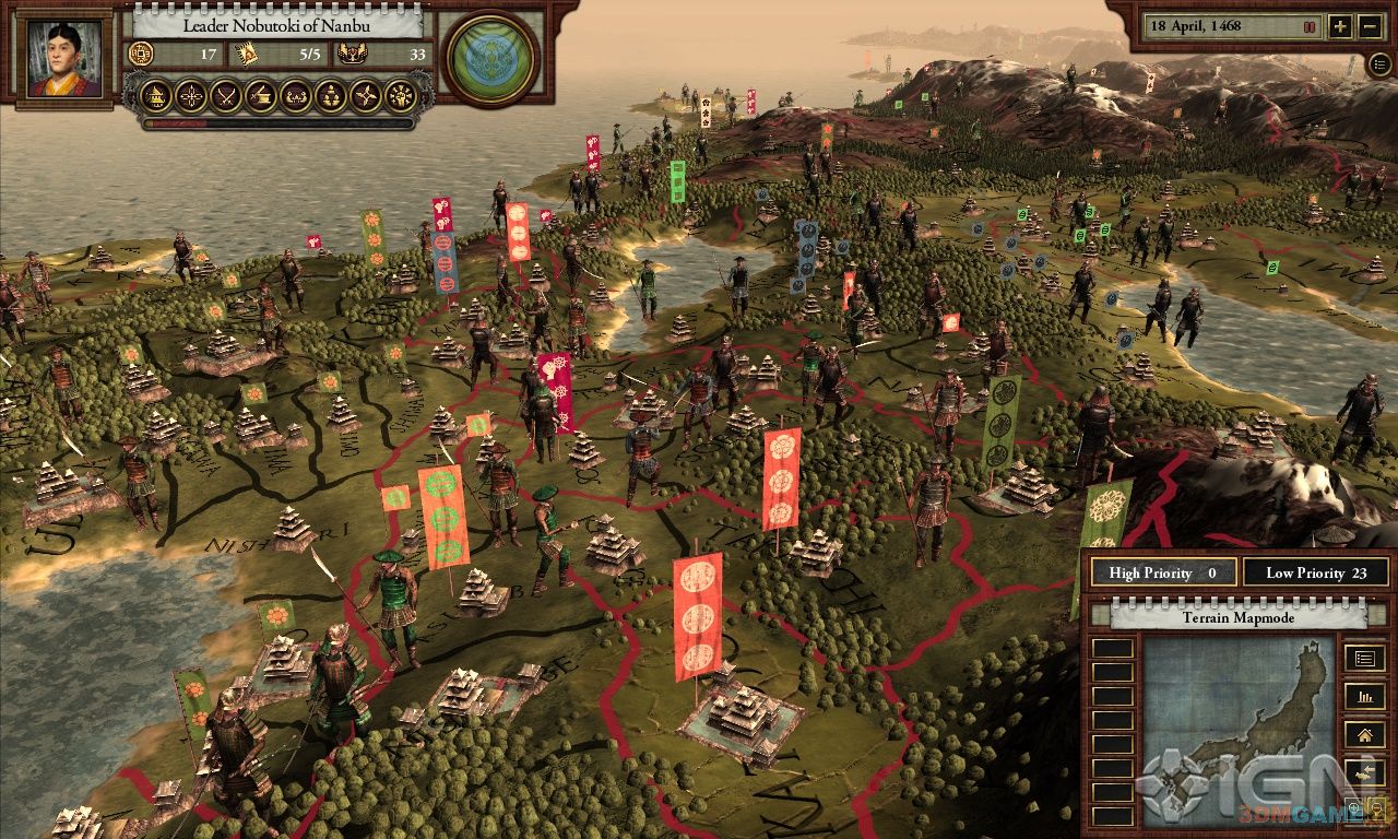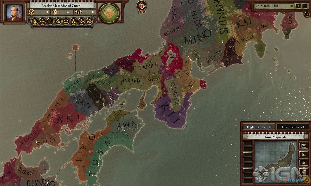 1467年后的日本,足利幕府被推翻,众多家氏为了成为新的幕府将军而拼得你死我活。整部游戏最关键的因素就是荣誉;荣誉决定着你家氏的随从。你可以通过交换人质、建造寺庙、奖励随从、帮助盟友等等方式获得荣誉;而发动战争和执行暗杀都需要花费你的荣誉。荣誉不高的大名不太可能统一日本。《战国》对于那些《钢铁雄心》系列粉丝来说有着巨大的吸引力。多人游戏允许32人同时对抗,世界设计本身就相当吸引人,菜单设计简约但相当有深度,总的来说,是一款很不错的游戏。