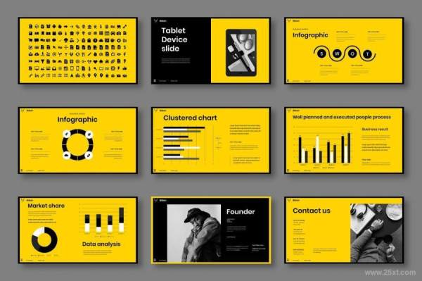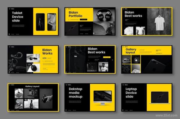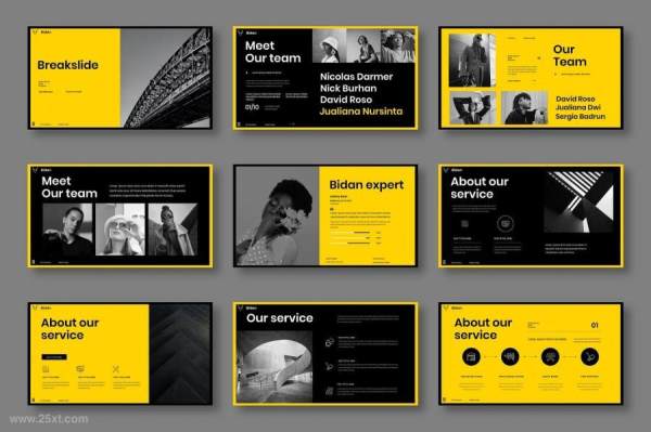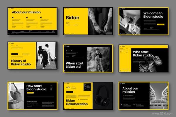 Bidan是一套商务主题的PowerPoint模板,整套模板以黄色黑色搭配使用,包含了39张独立设计的幻灯片,模板提供PowerPoint格式,页面尺寸为16:9,分辨率为1280(宽)×720(高)px,每个页面都经过精心设计。模板使用免费字体,包含众多图表,直观漂亮。其中图像素材易于编辑,您可以任意编辑大小,根据设计需求自由调整、随意更改编辑模板内的文字、图标、背景和图片。该模板可以用于各种目的,例如:创意代理、公司简介、公司业务等。