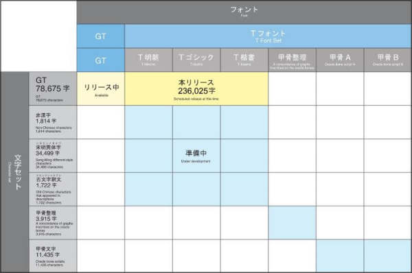 T字体的整体图如下所示。由于字符数量巨大,我们将按照完成各种维护工作的顺序将其发布给公众。这次,我们将发布Mincho,Gothic和适用于Windows和TRON格式的GT字符集的常规脚本的TrueType字体。