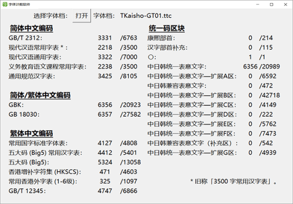 下面这个图统计了这款字体里面包含多少个简体字数和繁体字数等信息,方便大家直观地了解这款字体的简繁字体数量。中国大陆的小伙伴只需特别关注GB2312和3500字常用汉字表的数量就可以了。