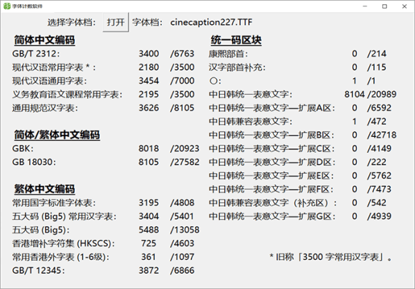 下面这个图统计了这款字体里面包含多少个简体字数和繁体字数等信息,方便大家直观地了解这款字体的简繁字体数量。中国大陆的小伙伴只需特别关注GB2312和3500字常用汉字表的数量就可以了。