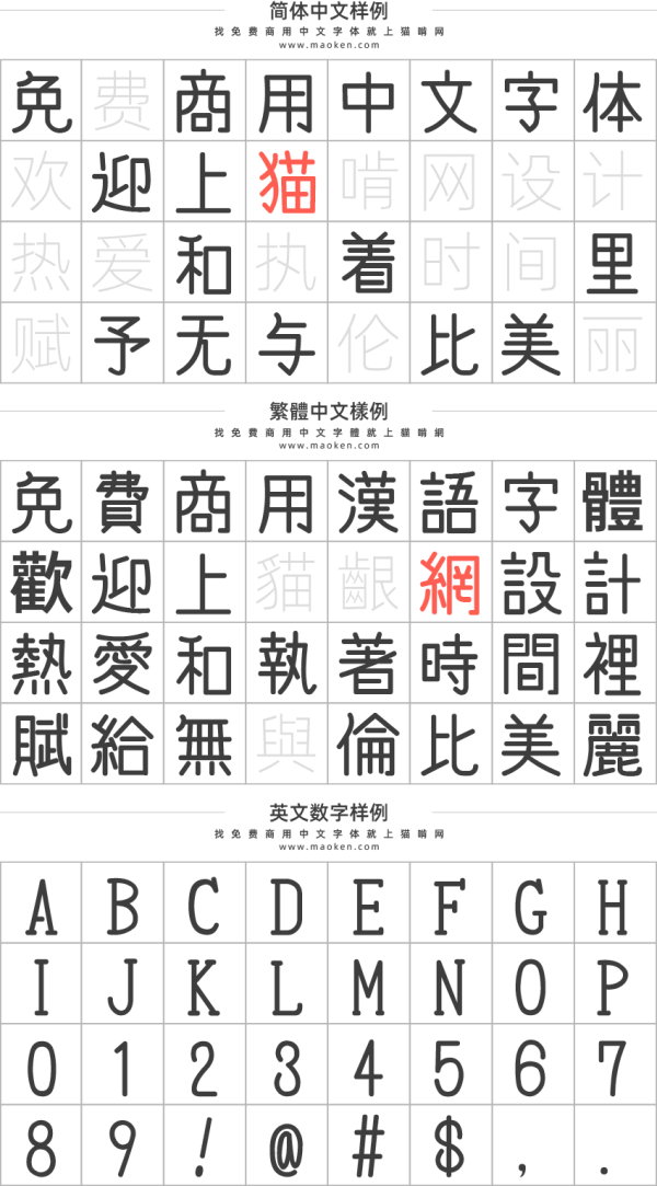 下面的字体使用范围是猫啃网按照经验整理的使用范围,仅供参考,具体的使用范围和场景,或者有特殊的需求或疑问,请自行联系字体作者咨询。