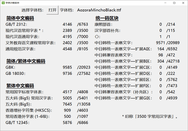 下面这个图统计了这款字体里面包含多少个简体字数和繁体字数等信息,方便大家直观地了解这款字体的简繁字体数量。中国大陆的小伙伴只需特别关注GB2312和3500字常用汉字表的数量就可以了。