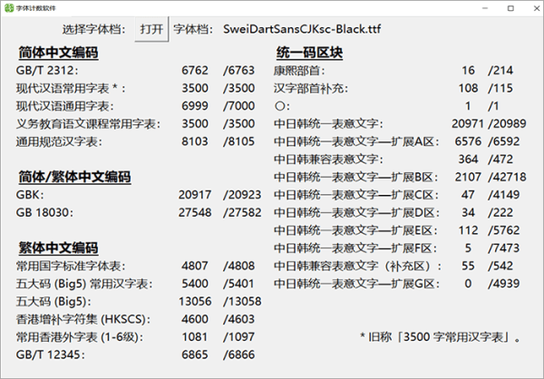 下面这个图统计了这款字体里面包含多少个简体字数和繁体字数等信息,方便大家直观地了解这款字体的简繁字体数量。中国大陆的小伙伴只需特别关注GB2312和3500字常用汉字表的数量就可以了。