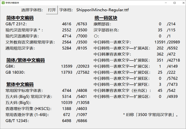 下面这个图统计了这款字体里面包含多少个简体字数和繁体字数等信息,方便大家直观地了解这款字体的简繁字体数量。中国大陆的小伙伴只需特别关注GB2312和3500字常用汉字表的数量就可以了。