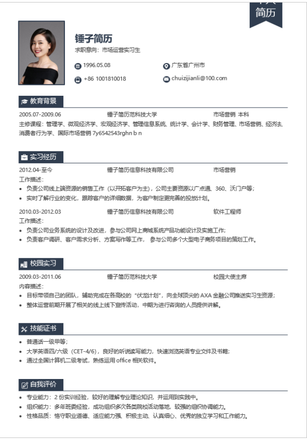 简历为word形式,本模板可以通用,简单大方。
