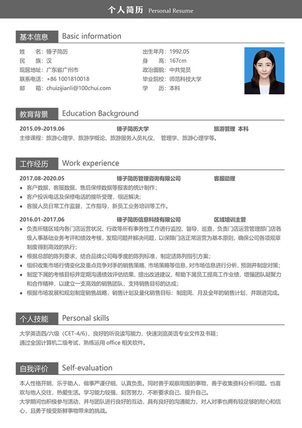 介绍:简历为word形式,适合应届毕业生在校招中求职行政、客服岗位时使用。