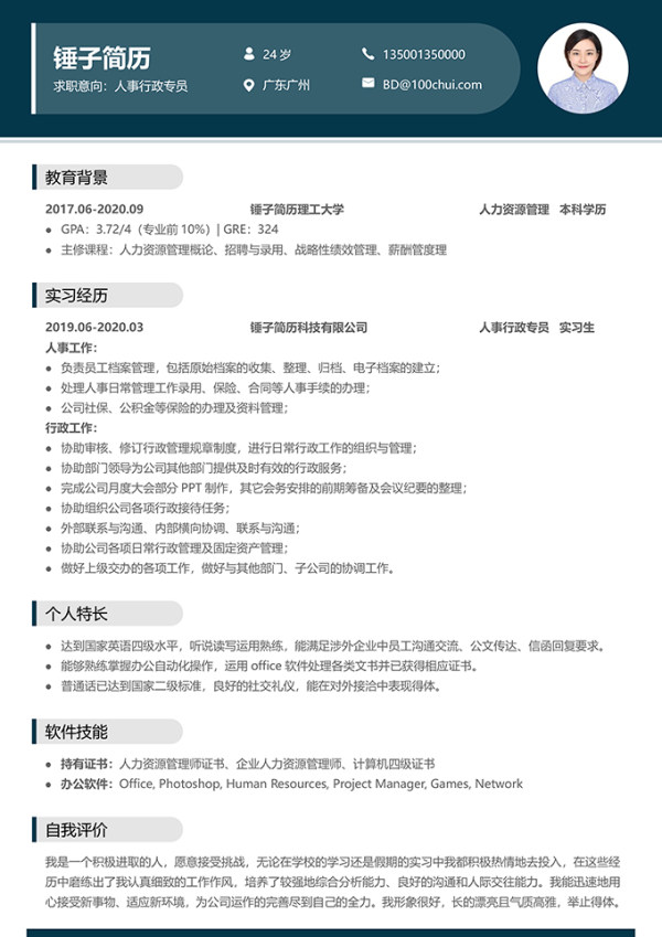 介绍:简历为word形式,适合应届毕业生在校招中求职人力资源岗位使用。