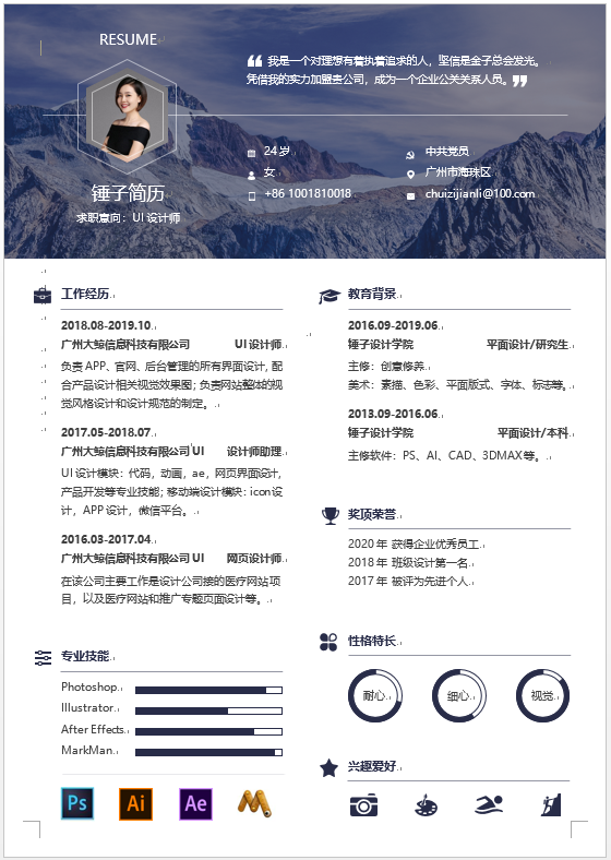 介绍:简历为word形式,适合应届毕业生在校招中求职设计岗位使用。