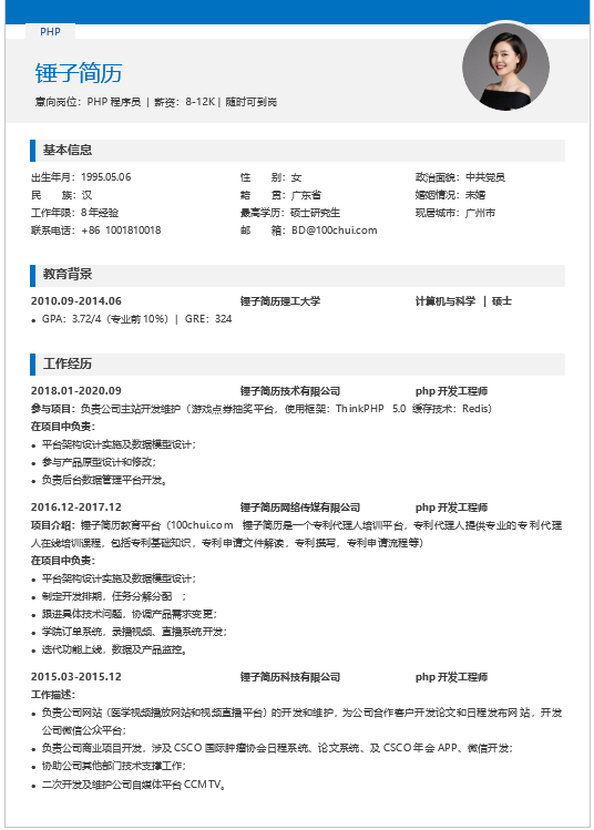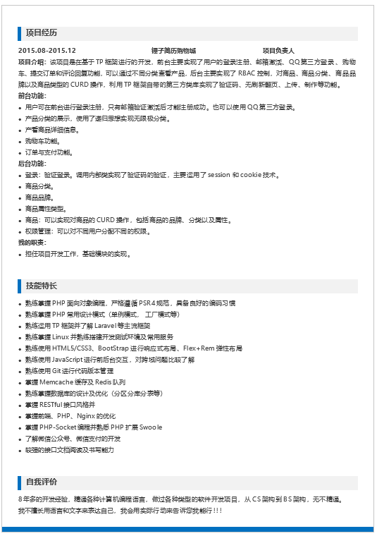 简历为word形式,适合在社招中求职PHP程序员。