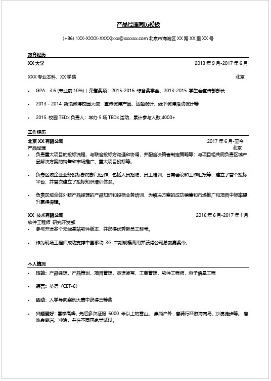 介绍:简历为word形式,适合应届毕业生在校招中求职互联网产品经理岗位使用。
