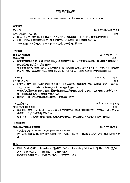 介绍:简历为word形式,适合应届毕业生在校招中求职互联网运营岗位使用。