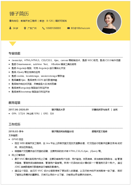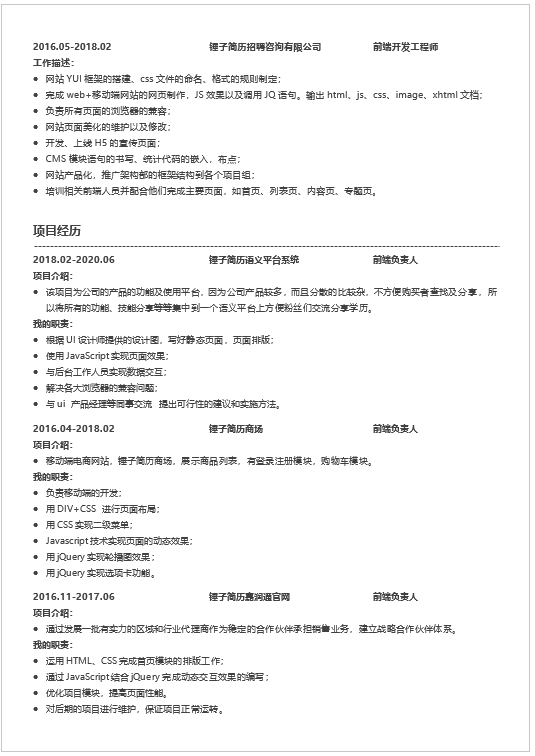 简历为word形式,适合在社招中求职前端开发工程师岗位使用。