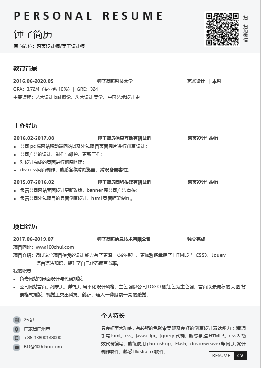简历为word形式,适合应届毕业生在校招中求职设计师/美工岗位使用。