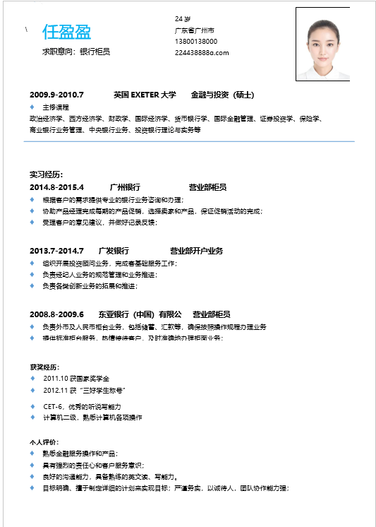 介绍:简历为word形式,适合应届毕业生在校招中求职银行岗位使用。