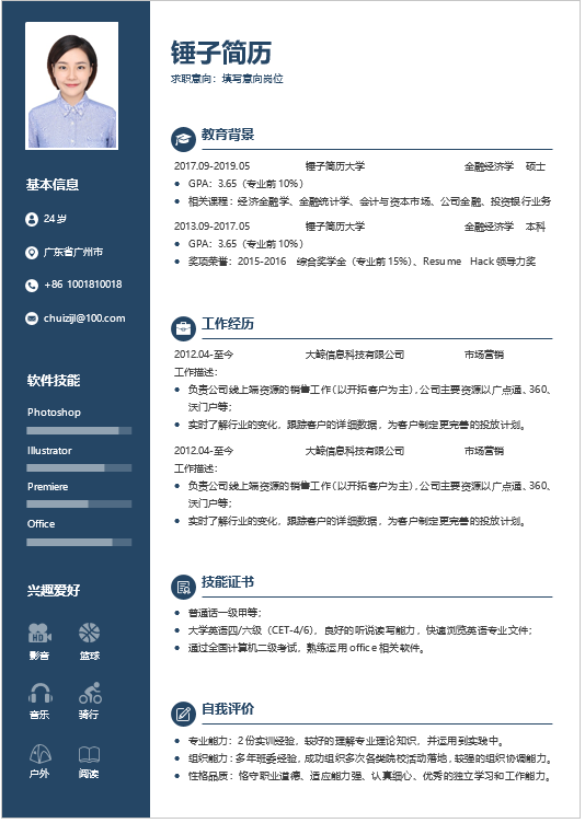 介绍:简历为word形式,适合应届毕业生在校招中求职银行岗位使用。