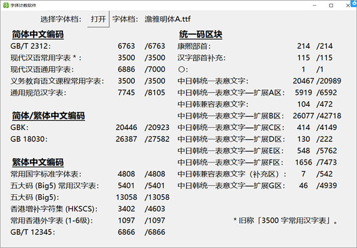 下面这个图统计了这款字体里面包含多少个简体字数和繁体字数等信息,方便大家直观地了解这款字体的简繁字体数量。中国大陆的小伙伴只需特别关注GB2312和3500字常用汉字表的数量就可以了。