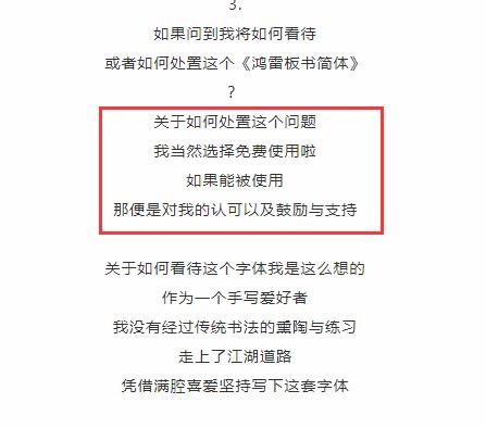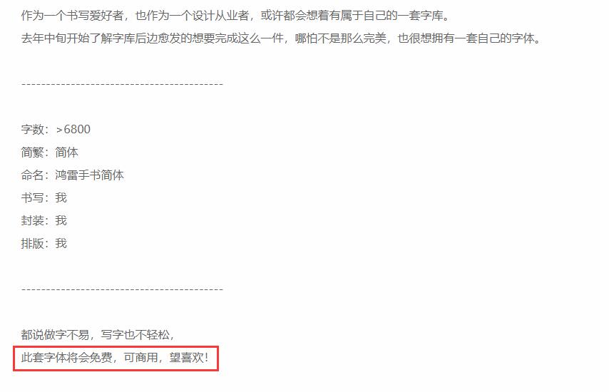关于如何看待这个字体我是这么想的“作为一个手写爱好者,我没有经过传统书法的熏陶与练习,走上了江湖道路,凭借满腔喜爱坚持写下这套字体。或许……这套糟糕的字体会拉低了行业字库的水准,但不管好坏也算是圆了我的字库梦想。”1、如果要问起为什么要写这个套字体?最初源于练字……当时没有什么可以写的内容,于是想到了抄写千字文。再后来,嗯,都写了1000字了,也不差剩下的五六千字了。于是就有了《鸿雷板书简体》。2、为什么叫板书简体呢?因为他是用手绘板写的简体部分3、如果问到我将如何看待或者如何处置这个《鸿雷板书简体》?关于如何处置这个问题,我当然选择免费使用啦。如果能被使用,那便是对我的认可以及鼓励与支持!