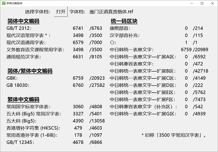 下面这个图统计了这款字体里面包含多少个简体字数和繁体字数等信息,方便大家直观地了解这款字体的简繁字体数量。中国大陆的小伙伴只需特别关注GB2312和3500字常用汉字表的数量就可以了。